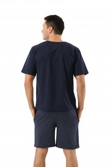 Herren Schlafanzug kurzarm mit kurzer Hose aus Stretch-Baumwolle in marine gemustert